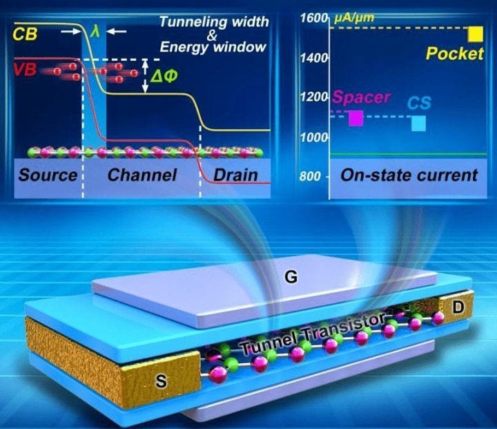 隧道場效應(yīng)晶體管(TFET-Tunnel Field Effect Transistor),和傳統(tǒng)MOSFET晶體管原理不同,在TFET中源極和漏極摻雜不同。它使用量子力學(xué)隧道效應(yīng),柵極和源極之間的電壓決定了電荷載流子是否可以“隧穿”通過源極和漏極之間的能量勢壘,以及電流是否可能流動(dòng)。