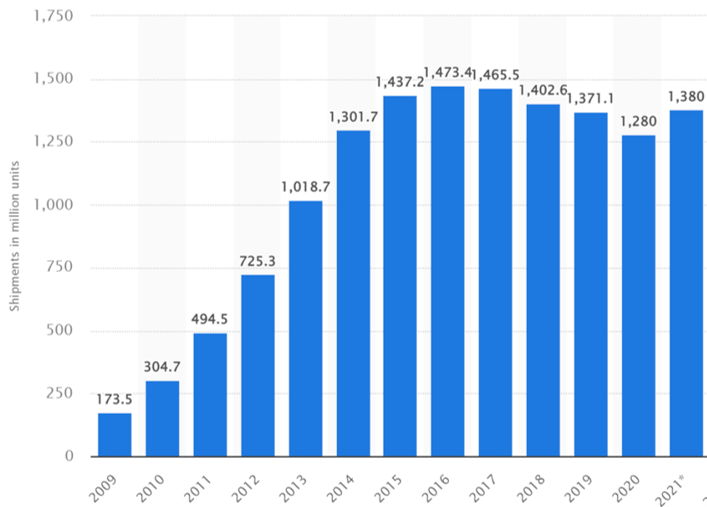 2017年以來(lái)全球手機(jī)出貨量持續(xù)下降,2021年略微回溫資料來(lái)源:Counterpoint